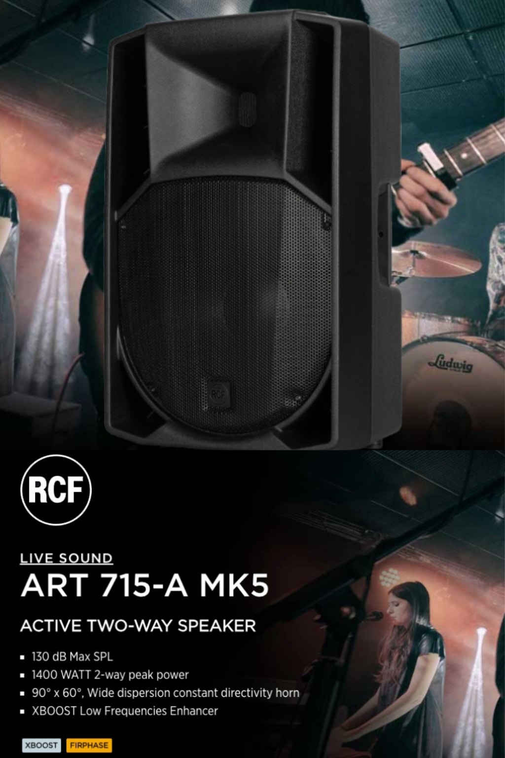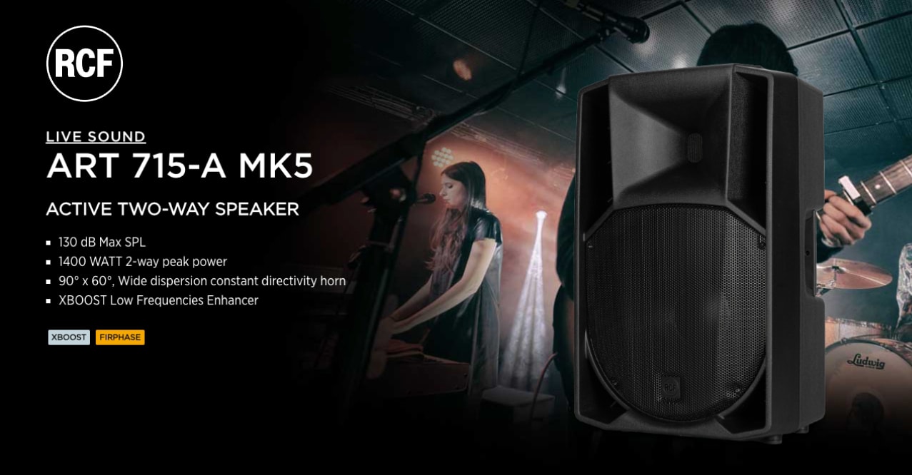 ตู้ลำโพงมีแอมป์ในตัว แบบ 2 ทาง RCF ART 715-A MK5 วูฟเฟอร์ขนาด 15 นิ้ว กำลังขับสูงสุด 1400 วัตต์ ให้ความดังสูงสุด 130 dB มี DSP พร้อมเทคโนโลยี XBOOST