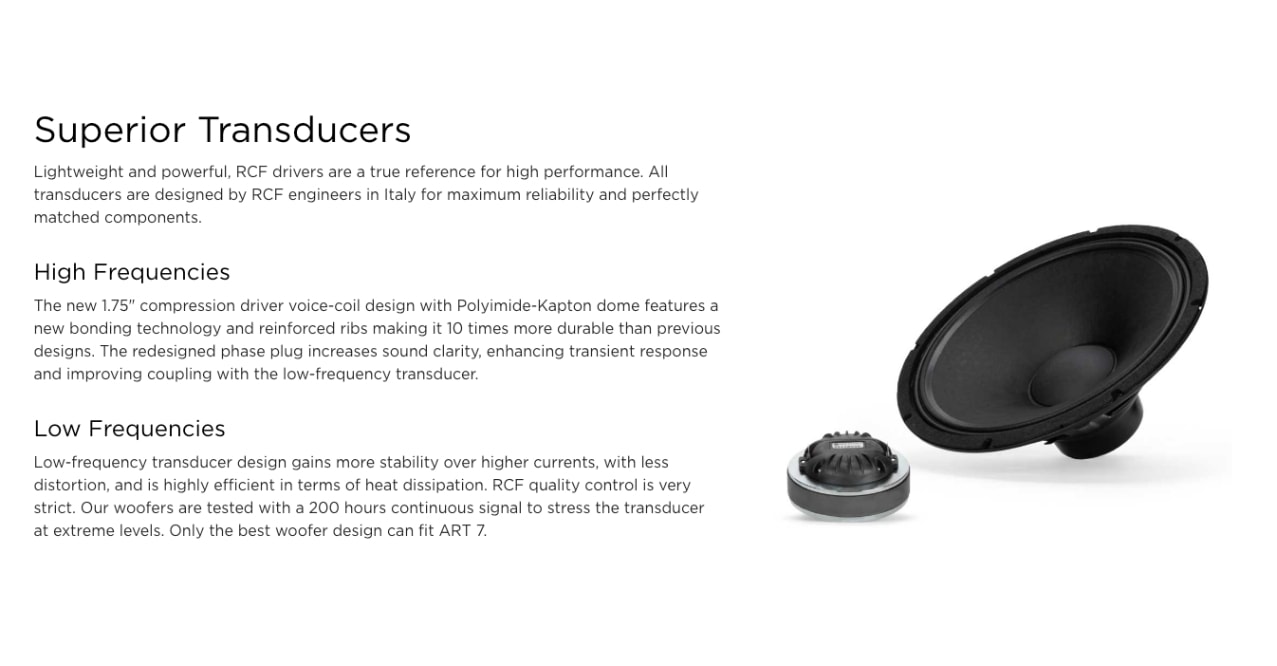 ART 715-A MK5 มาพร้อมการออกแบบวอยซ์คอยล์ไดรเวอร์การบีบอัดขนาด 1.75 นิ้ว โดม Polyimide-Kapton ให้เสียงที่คมชัด และครอบคลุมอย่างสม่ำเสมอ